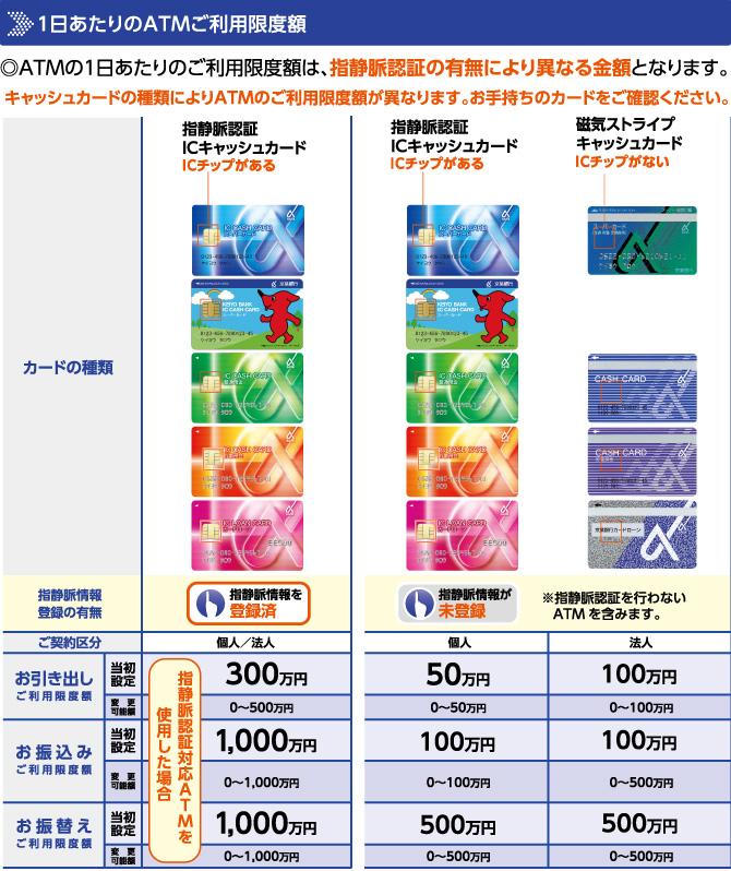 なお、ATM1日当たりのご利用限度額は、カードの種類、指静脈情報登録の有無により異なる金額となります。