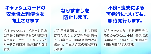 キャッシュカードの更なる安全性と利便性の向上を図るために、『ICキャッシュカード店頭即時発行』のお取り扱いをしております。店頭での即時発行では、カード発行と同時に指静脈情報の登録が可能です。