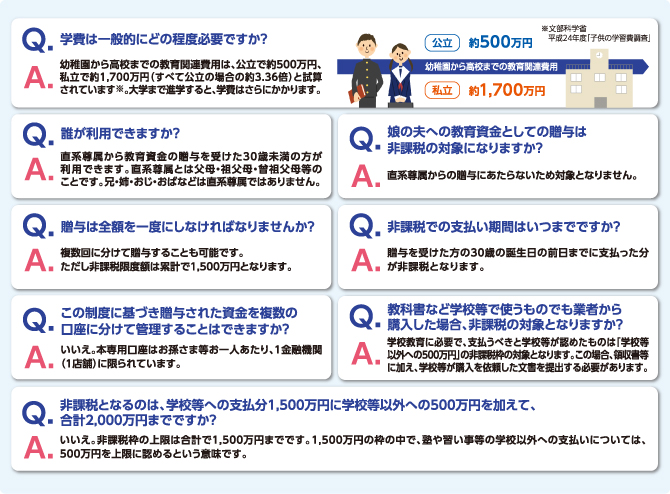 (お孫さま等が23歳以上の場合、一部の使途は非課税処置の対象外となります。)