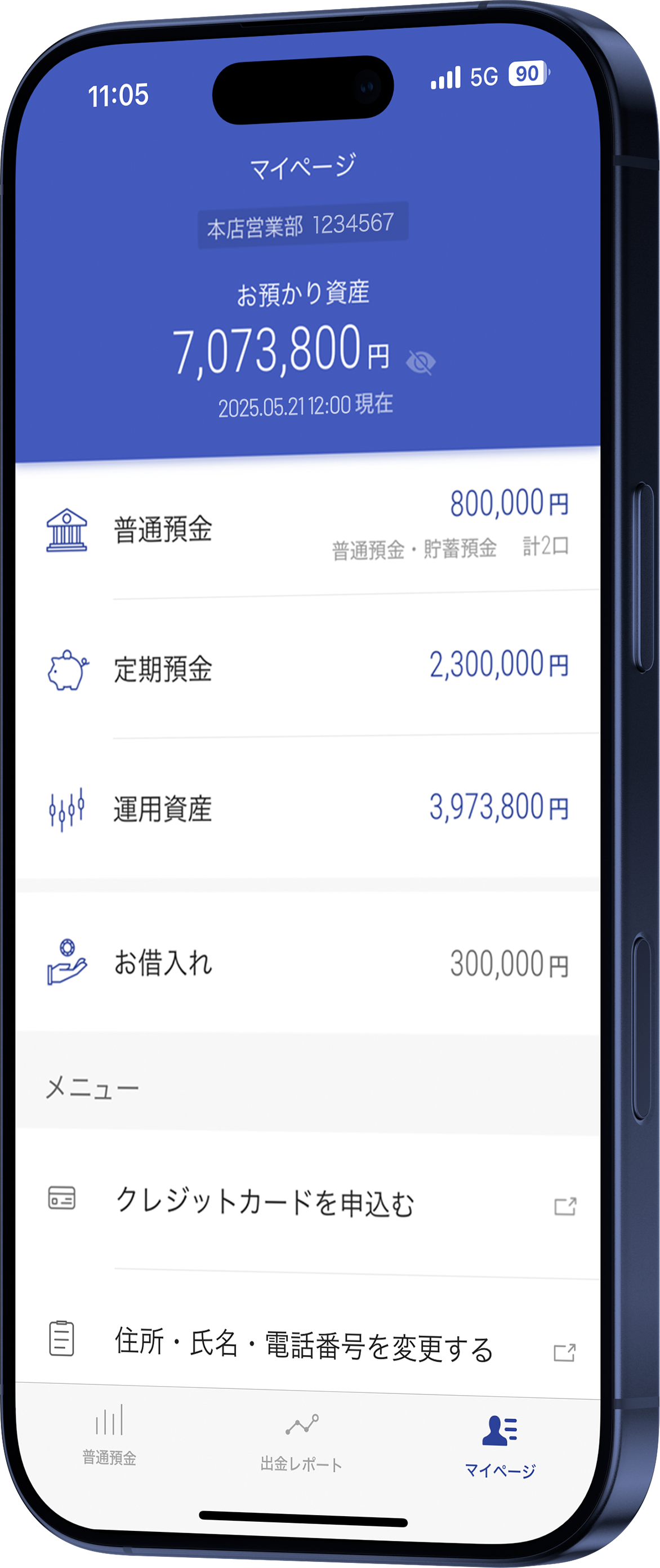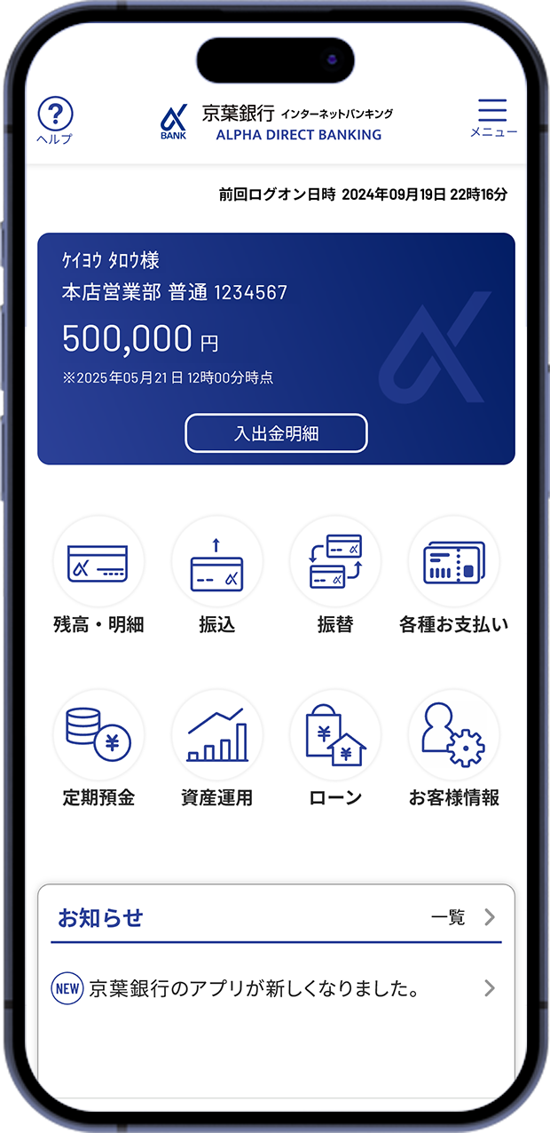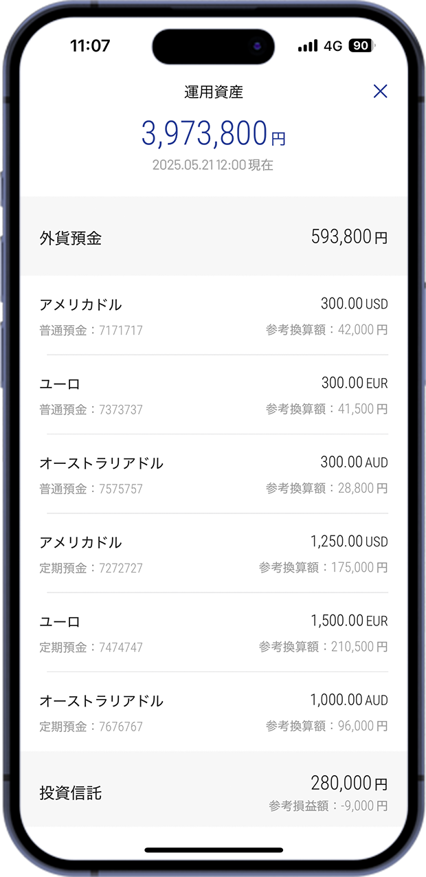 普通預金の残高・入出金明細照会による口座管理のほか、定期預金、外貨預金や投資信託などの資産を一覧で表示、資産管理を