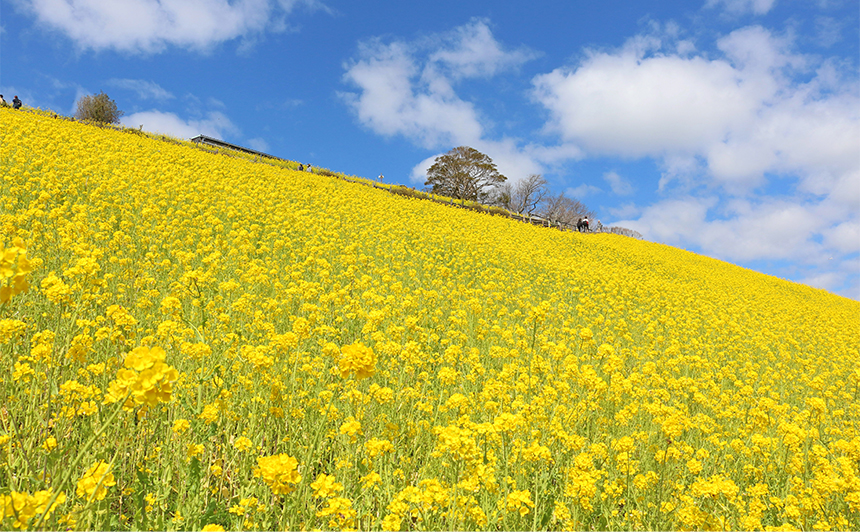 鮮やかな黄色の絨毯が一面に広がる菜の花畑は、千葉県の春を象徴する風景です。温暖な房総エリアを中心に畑や牧場などで見ることができ、早いところでは1月頃から咲き始めるところもあります。見頃は2月~3月頃で、春の始まりを感じさせてくれる花です。