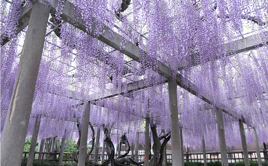 長く垂れ下がる花房が優雅な印象を与える藤は、お寺や公園などの藤棚で鑑賞されることが多い花です。紫や白の花が風に揺れる姿は、春ならではの風景だと言えます。見頃は4月下旬~5月上旬頃で、桜が終わった後の春を彩ります。