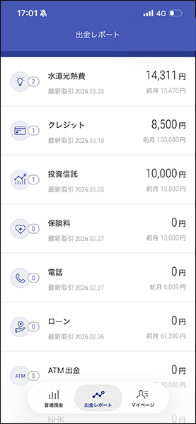 さまざまな出金明細が自動でカテゴリ分けされます。