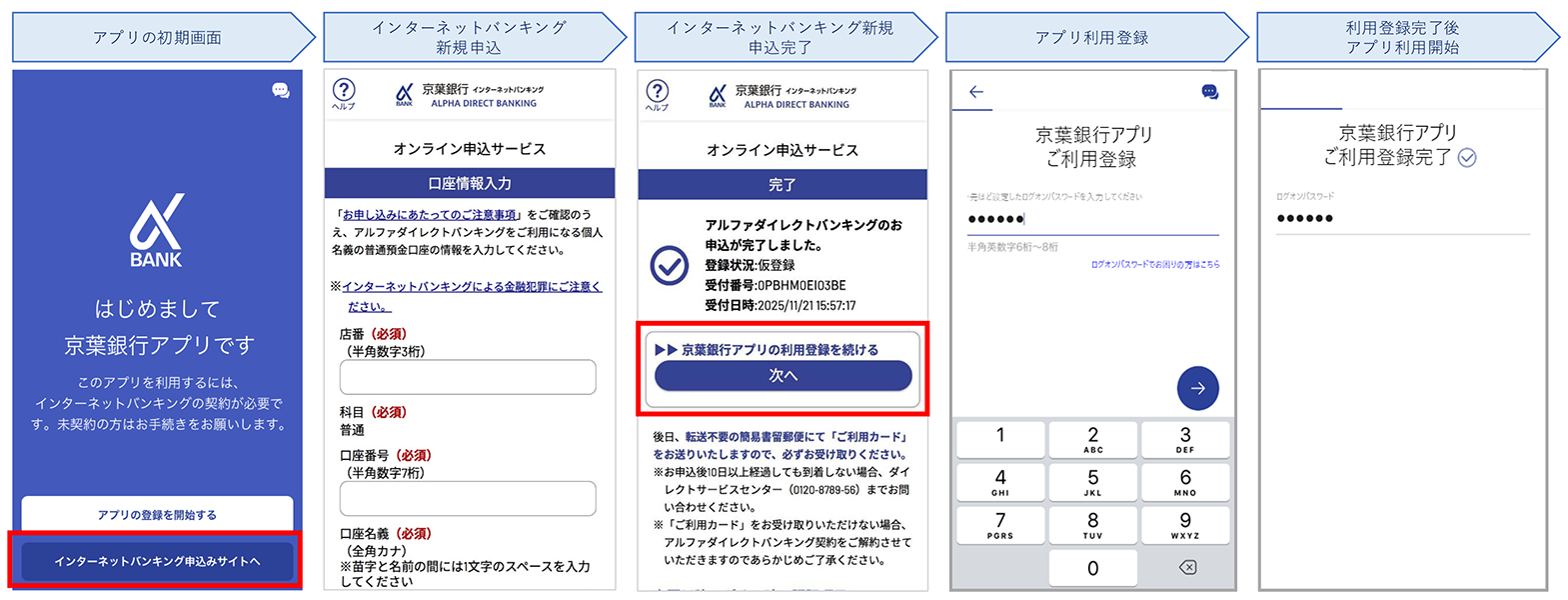 インターネットバンキングのご契約がお済みでない方も、アプリから「インターネット新規申込~アプリ利用開始」までのお手続きをワンストップでご操作いただけるようになりました。