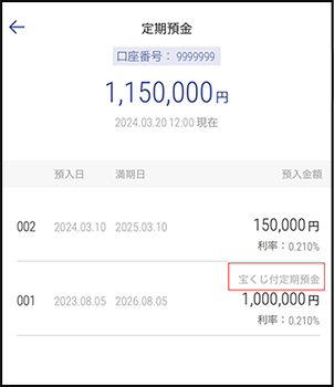 「宝くじ定期預金」等の商品名が表示されるようになり、定期預金がより一層管理しやすくなりました。